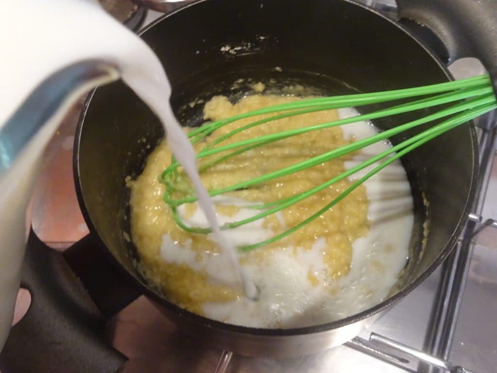 Una vez que la mantequilla y la harina estén bien mezcladas, vierte la leche previamente calentada y sigue mezclando con el batidor. Deja que espese, retira del fuego y añade una pizca de sal y una pizca de nuez moscada.