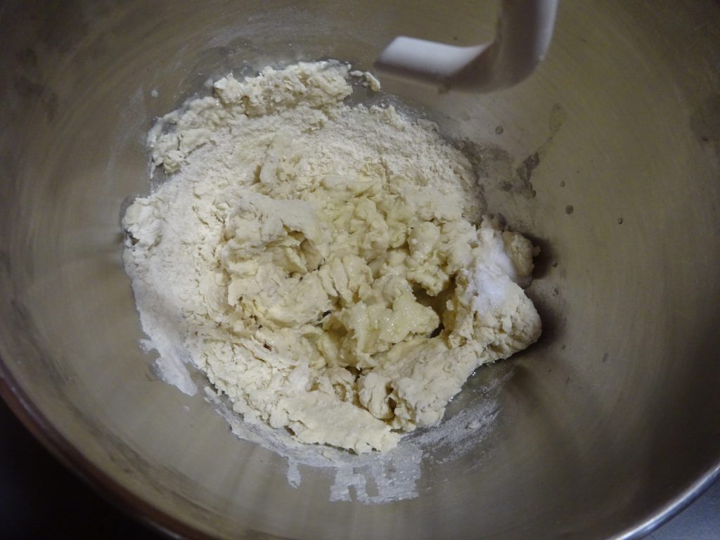 En el bol de la amasadora vierte la harina tipo 0 y la harina Manitoba, añade el azúcar y la levadura seca de panadero. Pon en marcha la amasadora y añade aproximadamente 2/3 del agua.