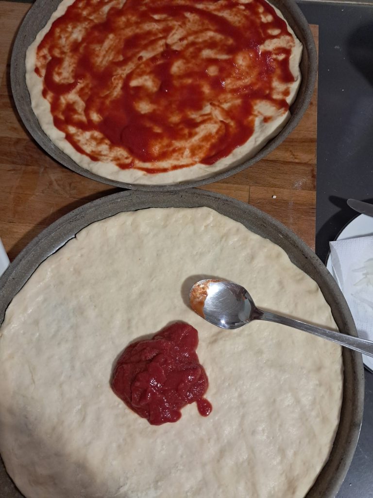 Finalizado el levado, reparte la passata de tomate sobre las pizzas y espolvorea con orégano.