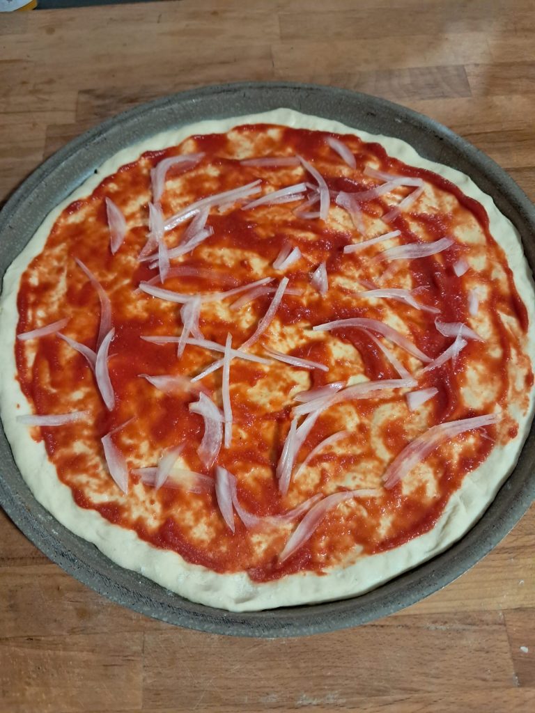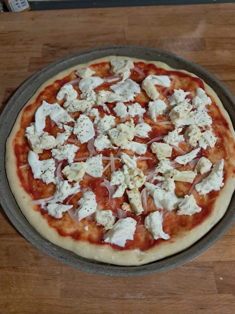 Pizza cebolla y gorgonzola, una pizza de sabor intenso. La cremosidad del Gorgonzola y la dulzura un poco punzante de la cebolla te conquistarán al primer bocado. Masa sencilla de preparar y, tras 4 horas de fermentación, está lista para rellenar y hornear.