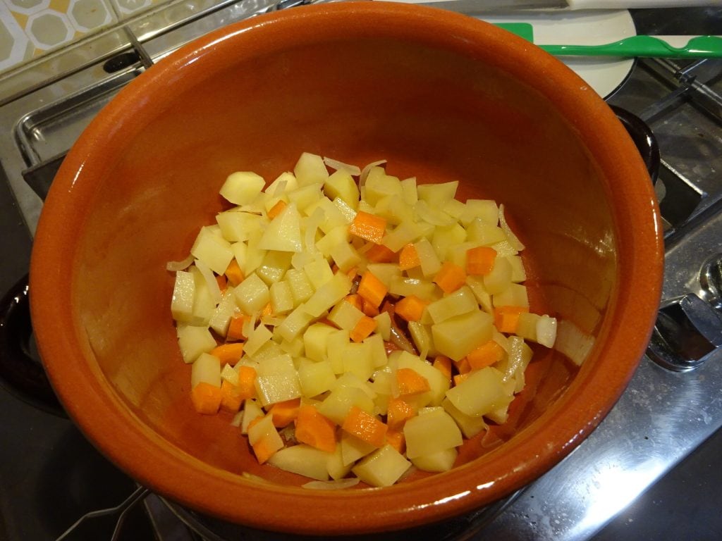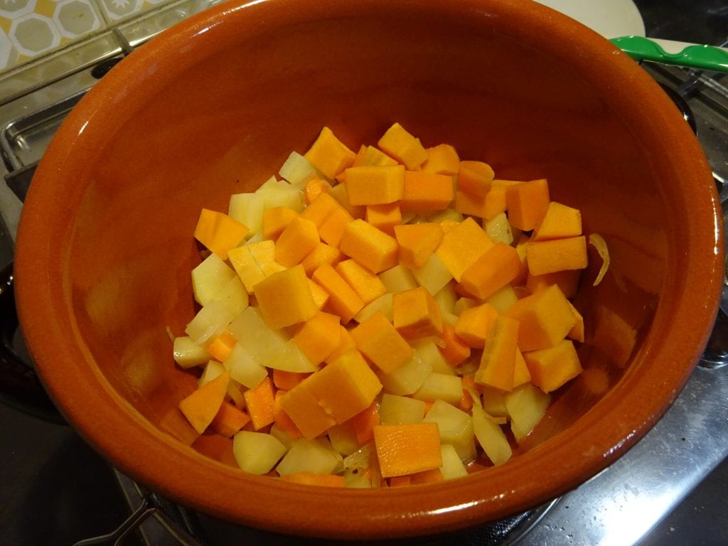 Mientras empiezan a cocerse las patatas, corta en trozos también la calabaza y luego agrégala a la cazuela con las otras verduras. Mezcla y prosigue la cocción.