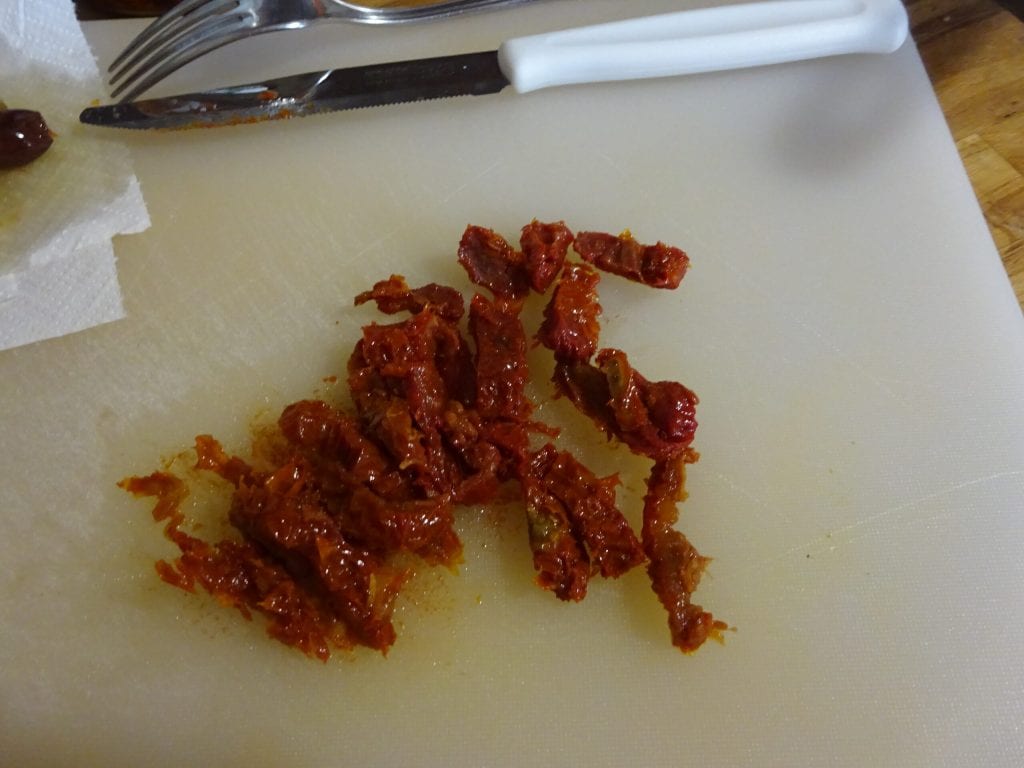 Mientras se cocina la pulpa de tomate, escurrid los tomates secos en aceite y cortadlos en tiras.