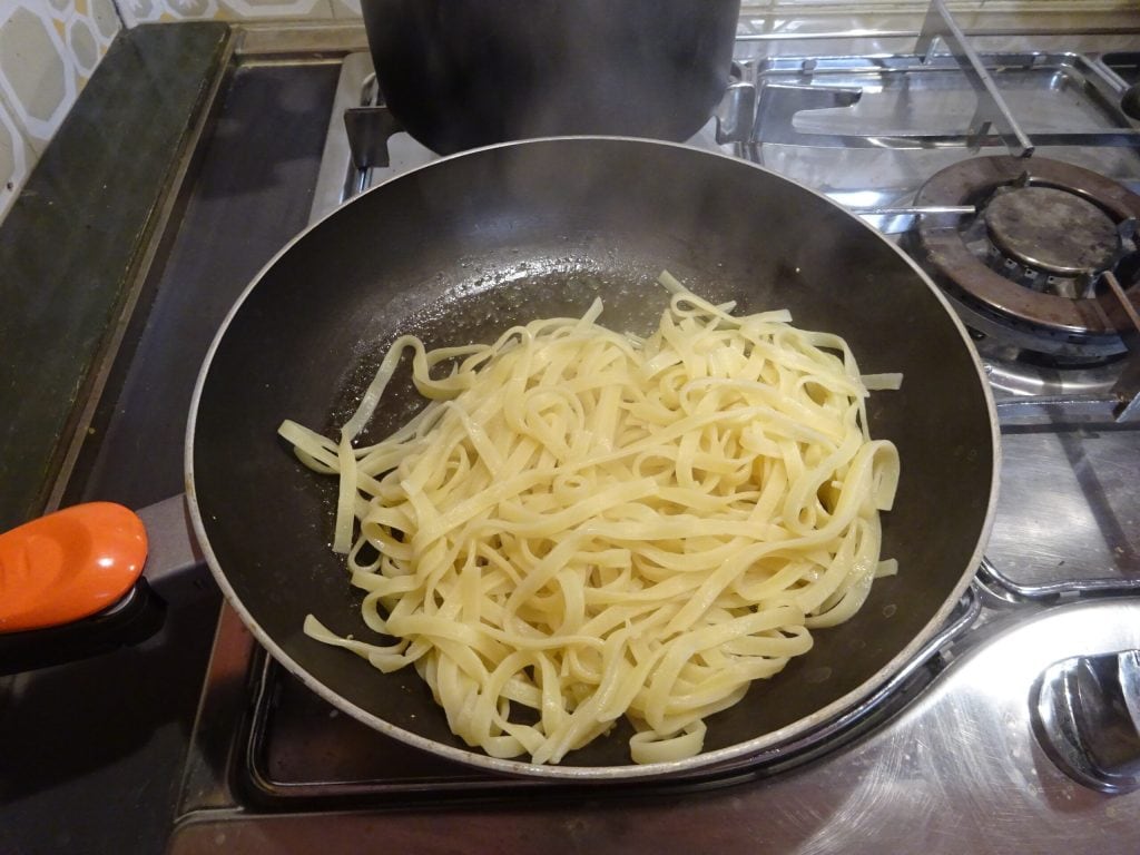 • Cuando las tagliatelle estén casi cocidas, escúrrelas directamente en la sartén con el jugo de limón.