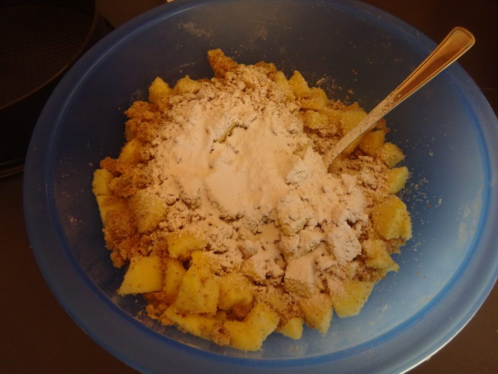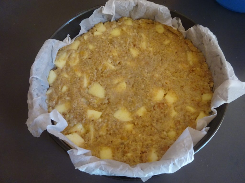Vierte la mezcla de la tarta de manzana y pan rallado, nivela bien e introduce en el horno precalentado a 180° durante 40 minutos.