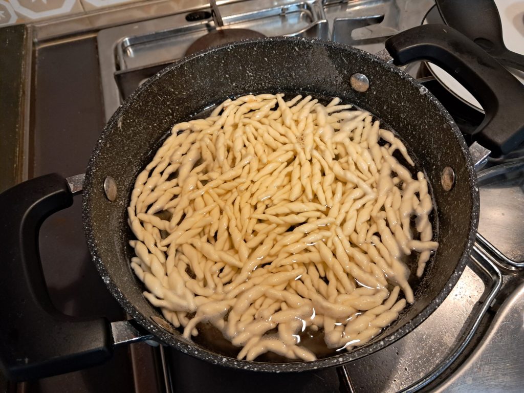 Cuando las trofie estén casi cocidas, escúrrelas directamente en la sartén con la salsa y mezcla para amalgamar bien la salsa con la pasta.