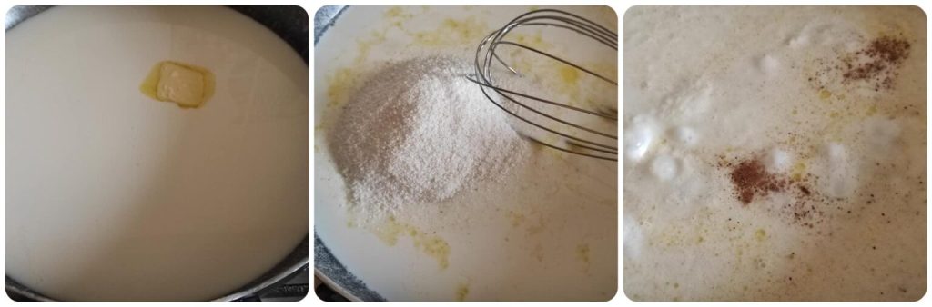 El roux (la base): En una cacerola antiadherente, derrite la mantequilla a fuego lento. Añade la harina tamizada y una pizca de nuez moscada. Remueve continuamente con una cuchara de madera o un batidor manual hasta que la mezcla tome un tono dorado.