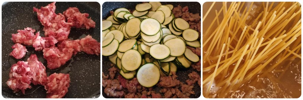 Antes que nada, ocuparte de la carne: quita la tripa de la salchicha y desmenúzala con las manos o con la ayuda de un tenedor, dejándola en pequeños trozos irregulares. A continuación, calienta una cucharada de aceite de oliva virgen extra en una cazuela amplia y dora la carne durante unos 5 minutos. Es fundamental dejar que la salchicha se vuelva bien dorada y libere todo su aroma; de hecho, será precisamente ese fondo de cocción sabroso el que haga especiales tus espaguetis.Mientras tanto, mientras la carne chisporrotea y coge color, puedes dedicarte a las verduras. Lava y corta los calabacines, luego córtalos en rodajas muy finas; para ello, usar una mandolina te garantizará un resultado perfecto y una cocción uniforme.