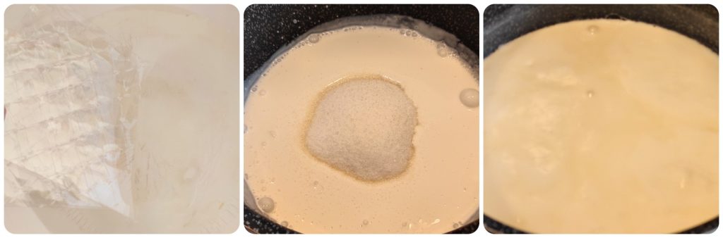 Integración de la gelatina: En cuanto la mezcla llegue al punto de ebullición suave, apaga inmediatamente el fuego. Escurre con cuidado las hojas de gelatina en hojas para eliminar el exceso de agua y añádelas a la nata caliente. Remueve enérgicamente con un batidor hasta que la gelatina esté completamente disuelta, asegurándote de que no queden restos.