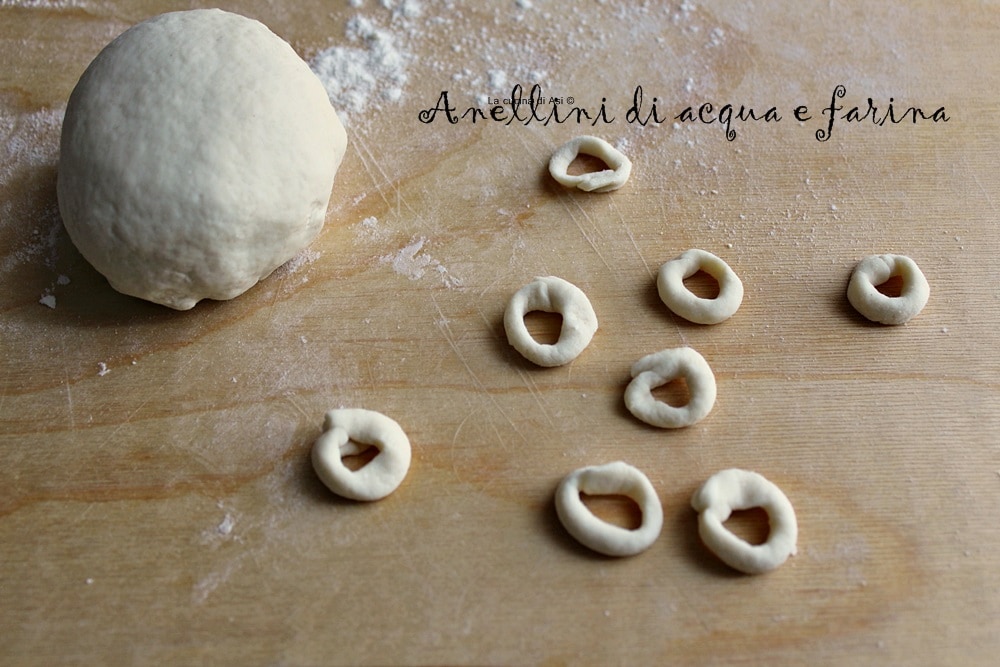 Hacer un pequeño pan y dejar reposar envuelto en papel film transparente para alimentos durante unos 20 minutos. Luego hacer rollitos como si fueran ñoquis y… con paciencia hacer los anillitos.