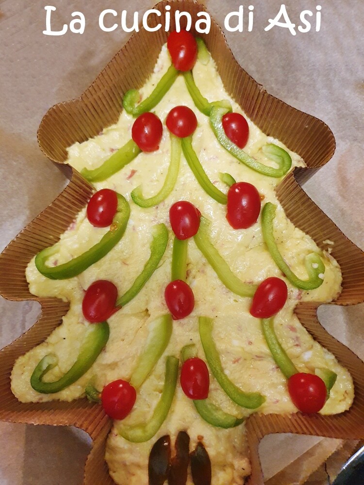 Decorar con tiras de pimiento verde para formar las ramas, tomatitos cortados a la mitad como bolitas navideñas y rodajas finas de tomatito verde para el tronco.Hornear en horno estático a 180°C durante unos 40-45 minutos, hasta dorar y hasta que el interior esté cocido tras hacer la prueba del palillo.