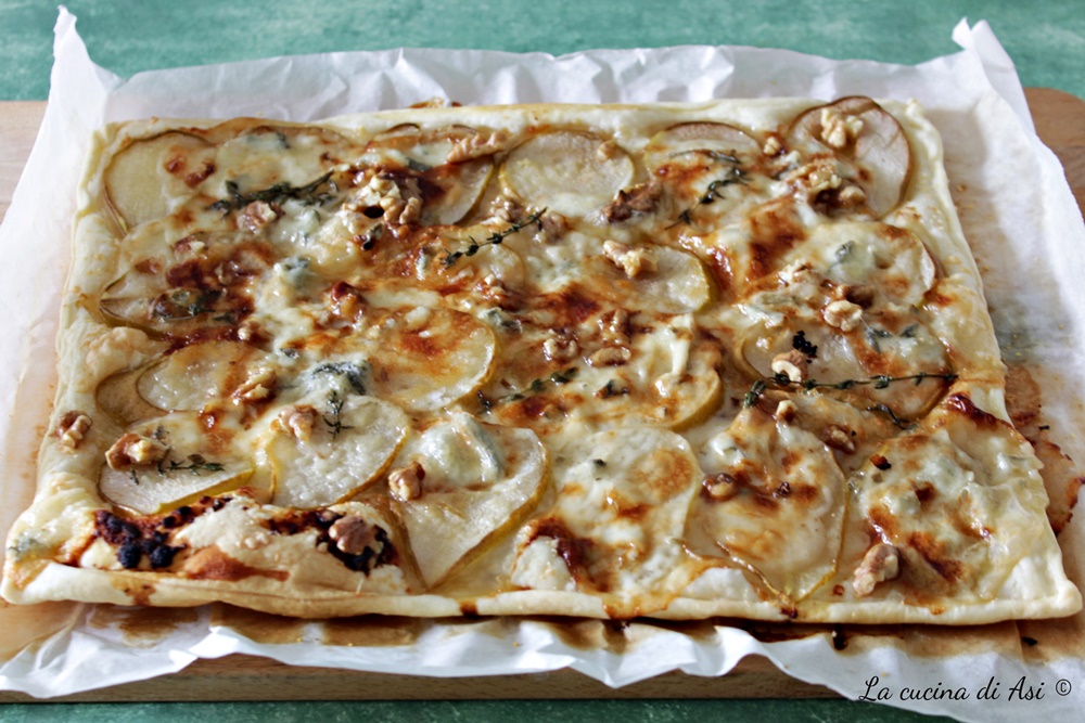 Hojaldre de peras, zola y nueces un aperitivo rápido para cortar en cuadritos, muy sabroso y que podemos variar usando gorgonzola picante o dulce.