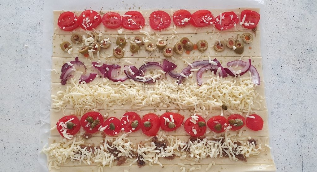 luego hacer muchas tiras de aproximadamente 3 cm y empezar a rellenar con tomatitos cherry lavados y cortados, rodajas de aceitunas verdes rellenas de pimiento, rodajas finas de cebolla roja, abundante mozzarella en juliana que encontramos ya lista en el supermercado, tomatitos cortados en rodajas con alcaparras desaladas rápidamente bajo agua corriente y una untada de pasta de anchoas y más mozzarella rallada!