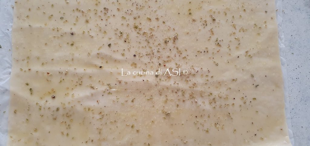 Unos pellizcos de sal fina, una rociada adicional de aceite de oliva virgen extra y al horno ya caliente a 190°C por 20/25 minutos o hasta ver las tiras de hojaldre doradas y crujientes.