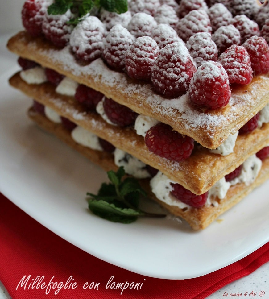 Milhojas con frambuesas un postre lleno de sabor con una crema enriquecida con gotas de chocolate muy golosa y agradable.