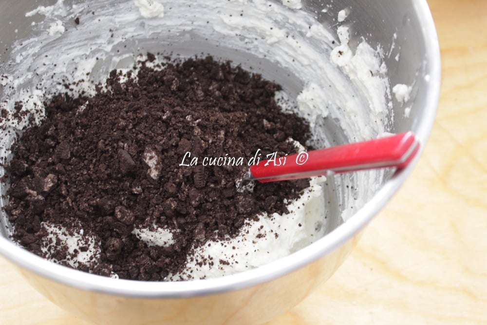 4)Mezclo bien integrando y luego añado también las galletas Oreo trituradas.