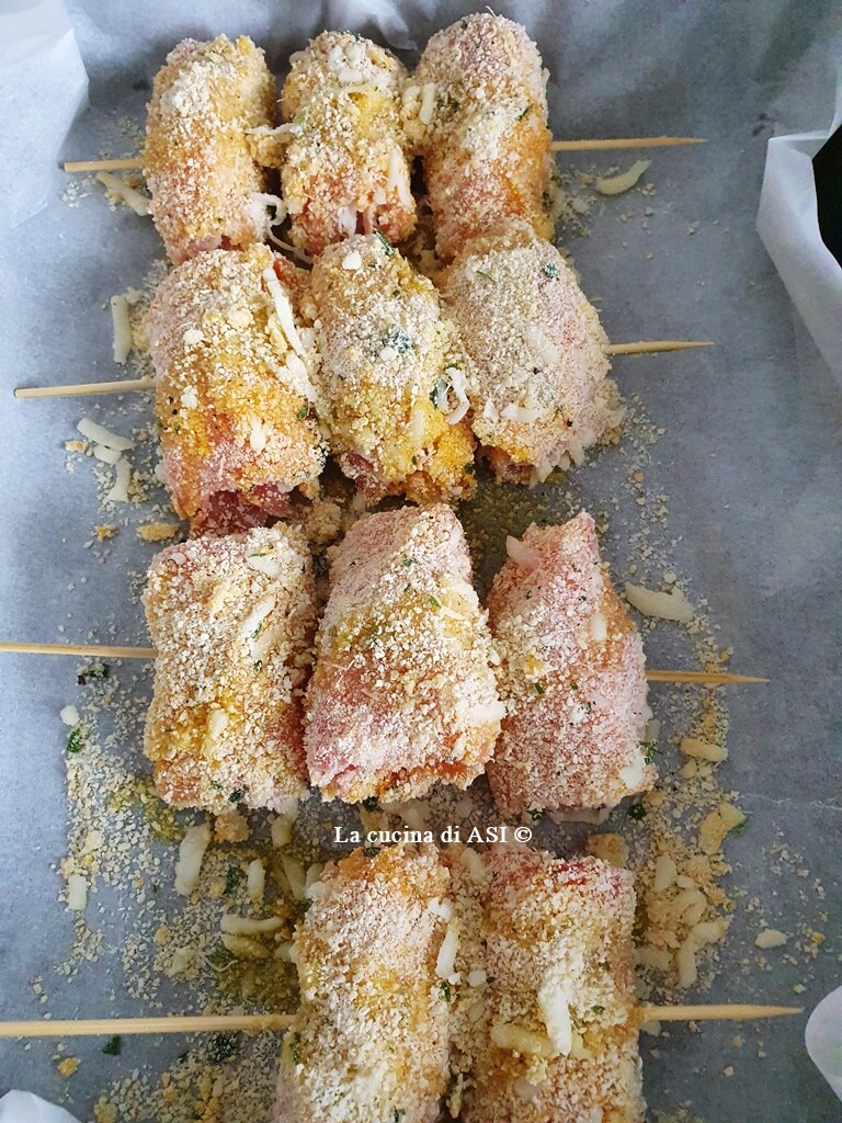 7) Luego precalenté el horno a 190°C y los horneé durante unos 25/30 minutos, girando las brochetas con cerdo relleno a mitad de tiempo de cocción.