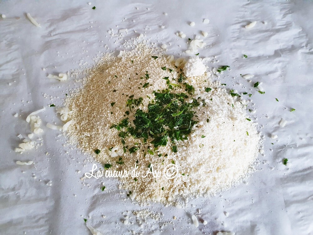 3) Al resto de la mezcla de quesos añadí para el empanado pan rallado y queso grana rallado, agregando también un poco de perejil picado, que siempre tengo disponible en el congelador si falta fresco