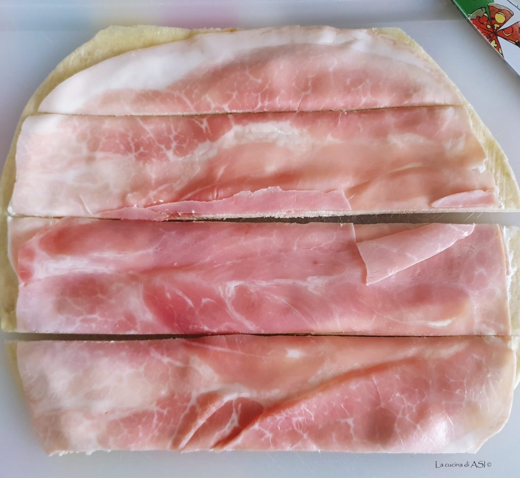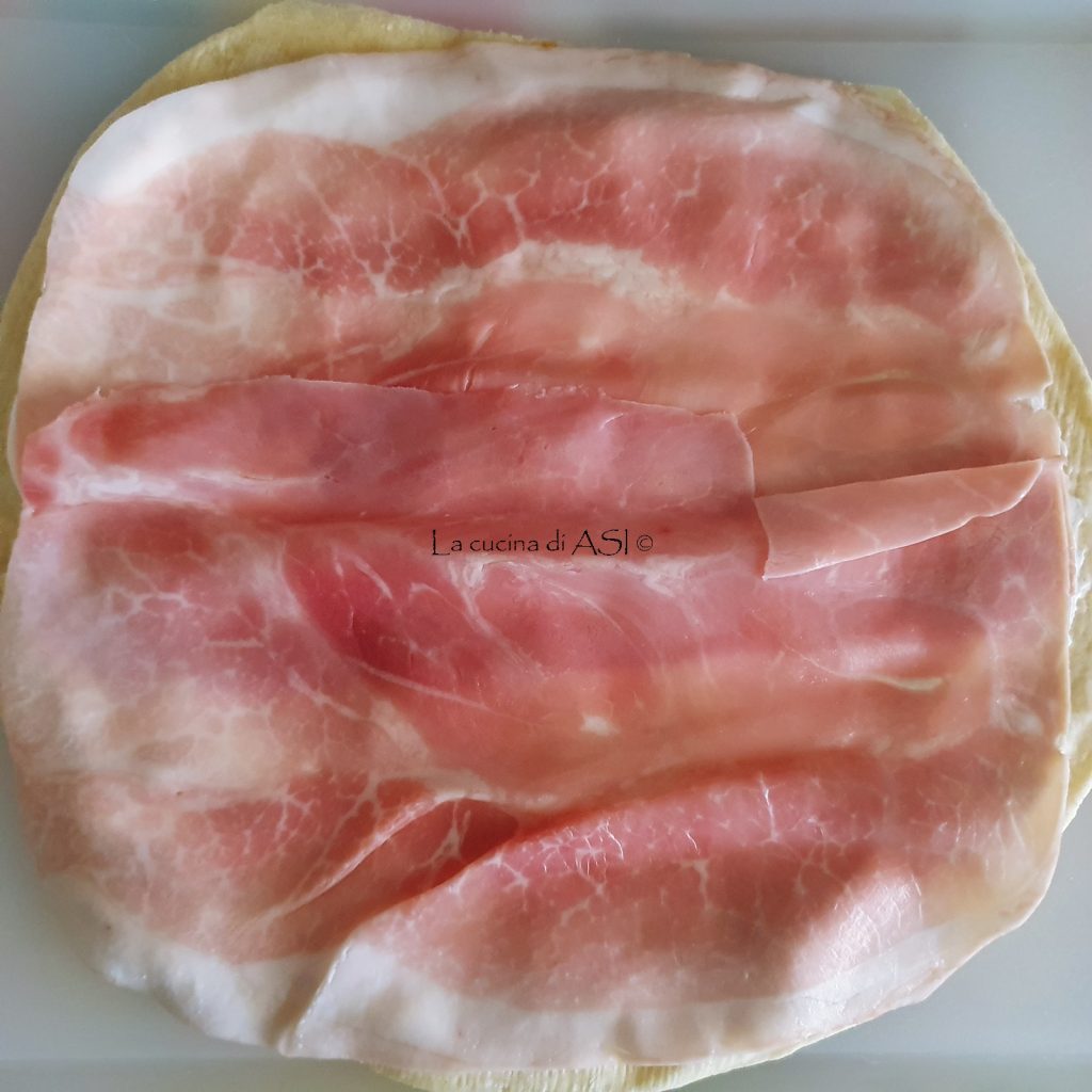 He usado queso para untar pero podemos usar robiola y mascarpone, después he superpuesto las lonchas de jamón cocido que podemos variar con lonchas de speck finas y más sabrosas y por último he puesto, haciendo que sobresalgan un poco, lonchas de scamorza, pero podemos optar por quesitos (bueno…) provola o mozzarella muy fina.