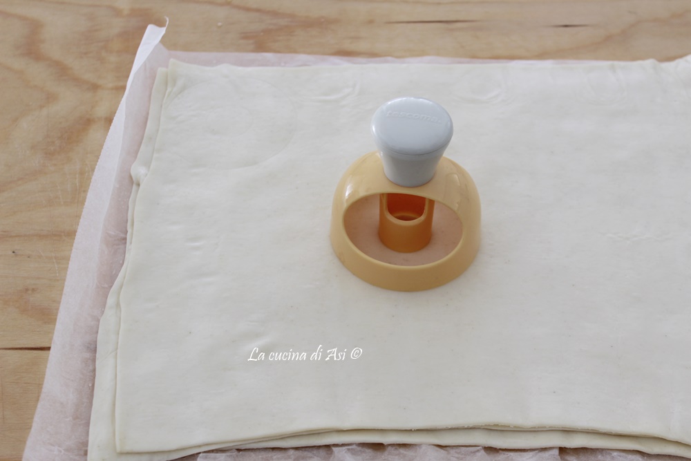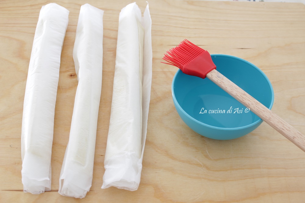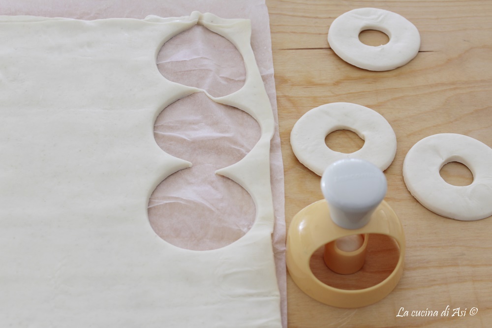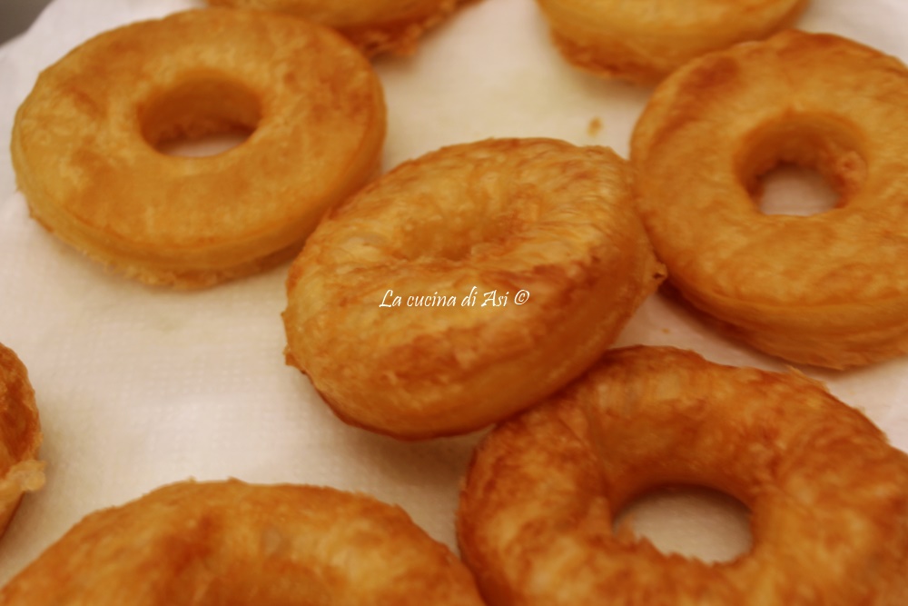 Estos dulces son rápidos porque están hechos simplemente con 3 capas de hojaldre listo unidas con una pincelada de agua que actúa como pegamento y luego, después de cortarlas al tamaño que prefiramos, las freímos alegremente sin pensar demasiado en las calorías, en aceite de semillas a la temperatura correcta (170-180°C).