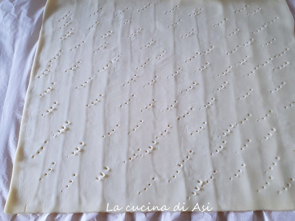 2) Con los dientes del tenedor pincho el hojaldre rectangular listo
