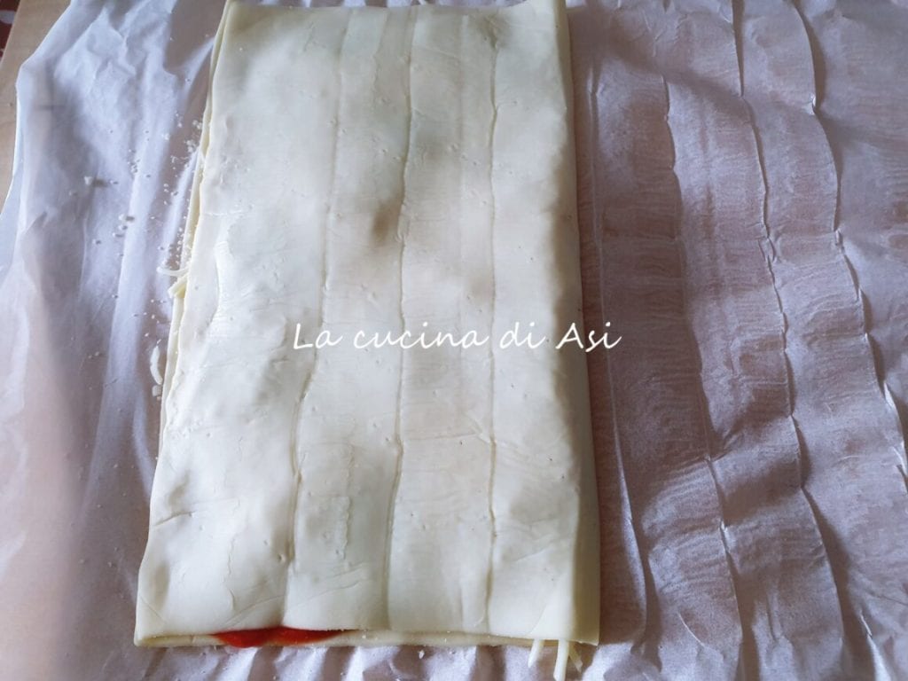6) Con los dientes del tenedor sello bien los bordes de los futuros hojaldrados saladitos a la pizzaiola y con un cuchillo marco ligeramente los cuadraditos con sabor a pizza incluso antes de hornear los hojaldrados con tomate y mozzarella.