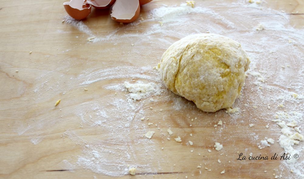 Hacemos un volcán con la harina en la tabla de amasar, ponemos los huevos en el centro y poco a poco amasamos recogiendo bien la harina.