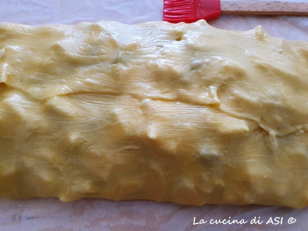 • 7) Cierra ahora el strudel enrollándolo o uniendo los dos lados largos del rectángulo y teniendo cuidado de no apretarlo demasiado, úntalo con una nuez de mantequilla (los 30 gramos restantes) en la superficie y hornéalo en horno precalentado a 180°C durante unos 50 minutos o según tu horno.