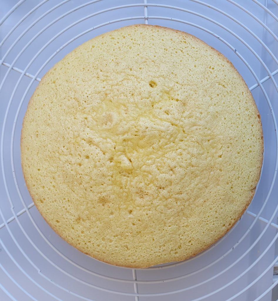 Cocida la tarta, la dejo enfriar y luego la corto en 3 rebanadas de grosor posiblemente igual.