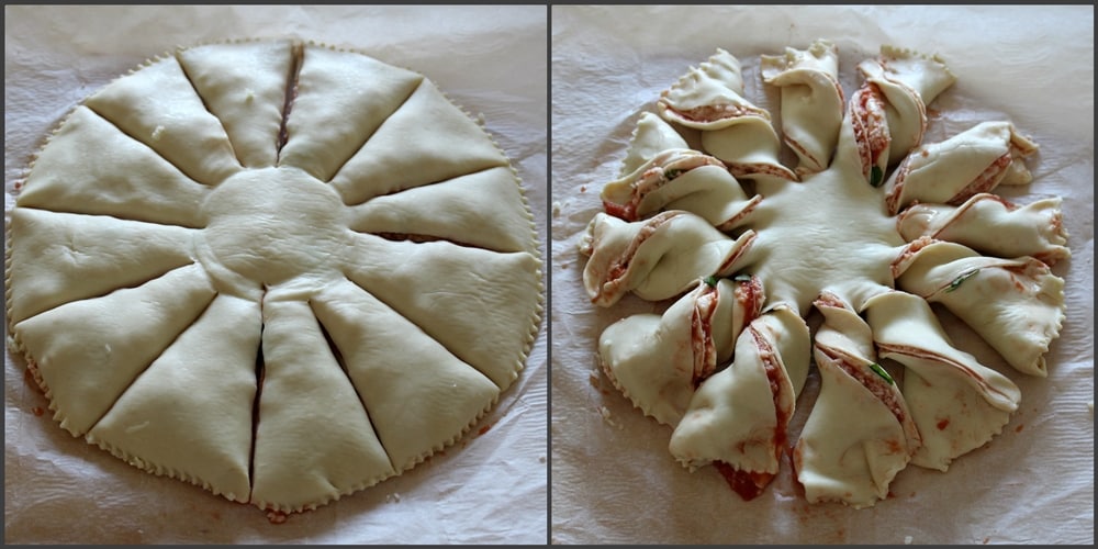 Con el cortador de pizza dentado o liso, marco muchos pétalos dejando intacto el círculo y luego pincelando la mezcla de yema y agua.