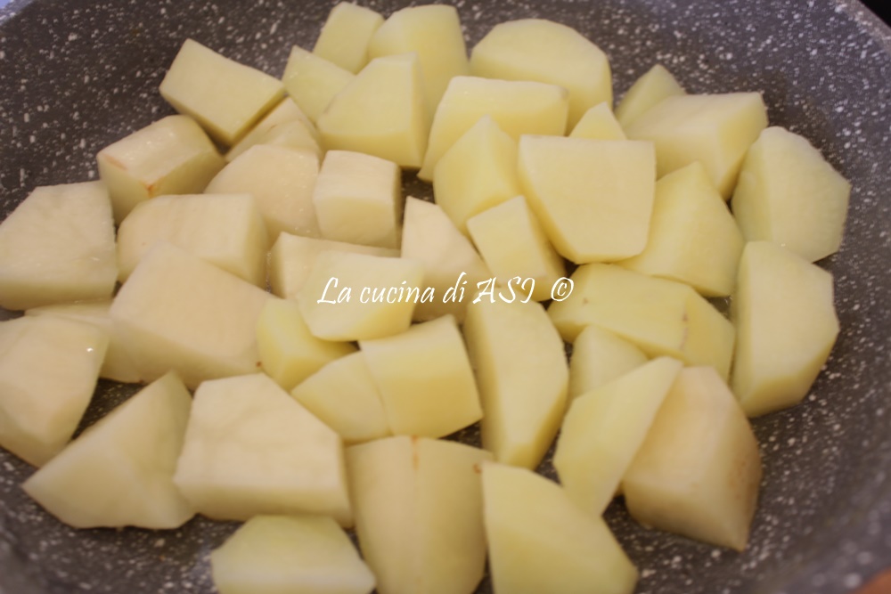 Agrego también las patatas y las dejo dorar para que se ablanden y formen una costra.