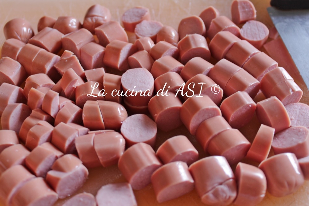 Utilicé unas salchichas pequeñas que habían quedado en el frigorífico (y que difícilmente encontraréis en nuestra casa), pero podéis usar las más gordas, las de cerdo, las de solo pollo e incluso las rellenas de queso.