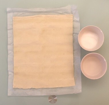 Desenrolla el hojaldre sobre el papel de horno, luego con una brocha extiende una ligera capa de jarabe de azúcar preparado previamente. Espolvorea con azúcar glas. Pasa el rodillo rápidamente sobre el azúcar para que se adhiera mejor.