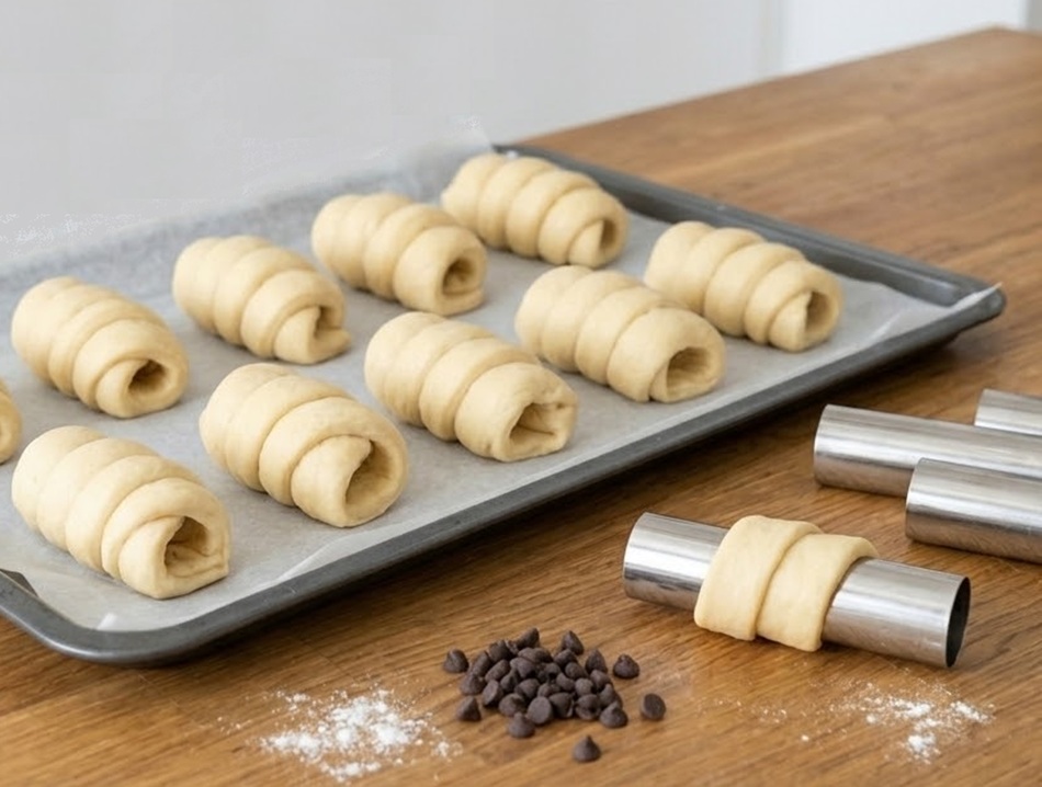 • Una vez que la masa haya doblado su volumen, divididla con el raspador en 12 porciones de aproximadamente 75 g cada una. Formad cordones de unos 30 cm girándolos sobre la superficie. Tomad los cilindros para cannoli y enrollad la masa alrededor de ellos dando 3 o 4 vueltas, asegurando bien los extremos. Colocadlos sobre una bandeja con papel de horno, separados entre sí, y dejad que leven cubiertos durante otra hora.