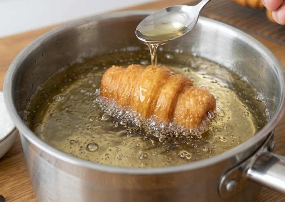 El truco de la cuchara: Durante la fritura, «regar» el cartoccio con aceite hirviendo usando una cuchara ayuda a la brioche a desarrollar esos alveolos internos que la hacen extremadamente ligera.