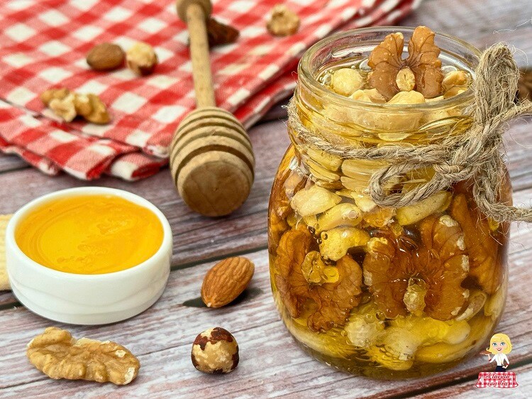 Para preparar los Frutos secos y Miel puedes elegir cualquier tipo de fruto seco: almendras, nueces, avellanas, nueces de macadamia, anacardos o incluso una mezcla de tus favoritas. Lo mismo se aplica para la miel, ya sea de acacia, millefiori, o cualquier otra miel, no importa, el único consejo que me siento de daros es elegir una miel de sabor delicado para no dominar demasiado el de los frutos secos.