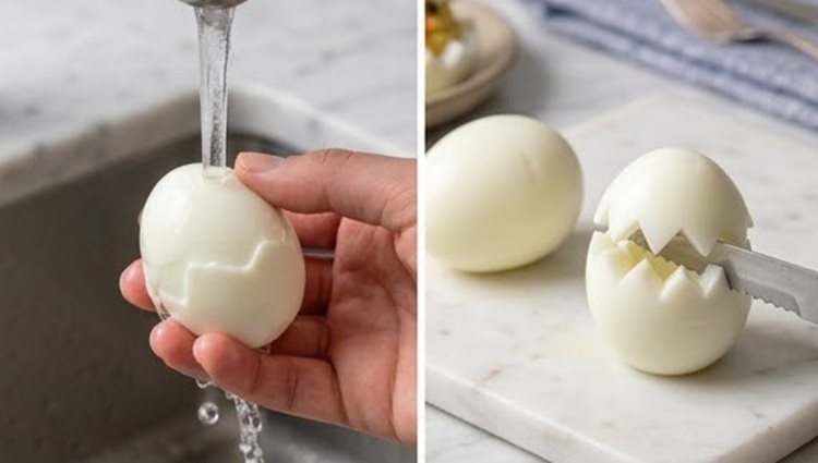 Peladlos bajo un chorro de agua fría: el agua ayuda a separar la membrana de la cáscara sin arrancar la clara, dejándola muy lisa.