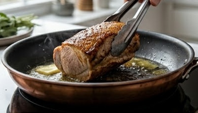 En una sartén antiadherente, calienta el aceite junto con la mantequilla. Cuando empiece a chisporrotear, coloca el lomo y dóralo a fuego medio-alto. Gíralo por todos los lados con unas pinzas: es fundamental obtener una corteza dorada uniforme sin perforar la carne, para sellar los jugos en su interior.