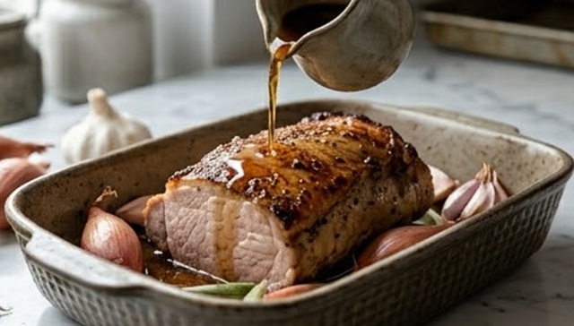 Una vez fuera del horno, cubre el lomo con una hoja de aluminio (sin apretar) y déjalo reposar 10-15 minutos. Este paso permite que las fibras se relajen y los jugos se redistribuyan: si lo cortas de inmediato, los jugos saldrán todos en la tabla y quedará seco. Filetea y sirve con el fondo de cocción colado.