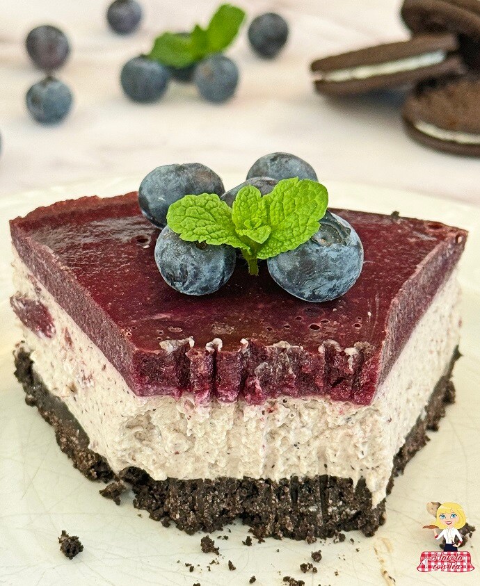 La crema de la OREO Cheese cake sin cocción está compuesta principalmente de queso crema, nata montada y leche condensada en lugar de azúcar, además de obviamente un puré de arándanos simplemente triturados en frío y mezclados con gelatina, necesaria en los postres sin cocción para dar consistencia a la tarta.