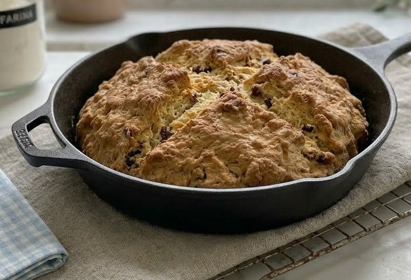 Este pan irlandés es mágico porque la fermentación ocurre directamente en el horno gracias a la reacción entre el bicarbonato y la parte ácida del suero de leche (buttermilk).