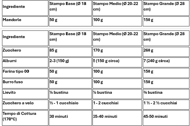 Con esta tabla se han adaptado las cantidades de los ingredientes según el diámetro del tipo de molde para pasteles utilizado. Los tiempos de cocción obviamente cambian para Molde 20/22 cm (aproximadamente 5 minutos más) y Molde 28 cm (aproximadamente 10 min más). Te recomiendo siempre hacer la prueba del palillo