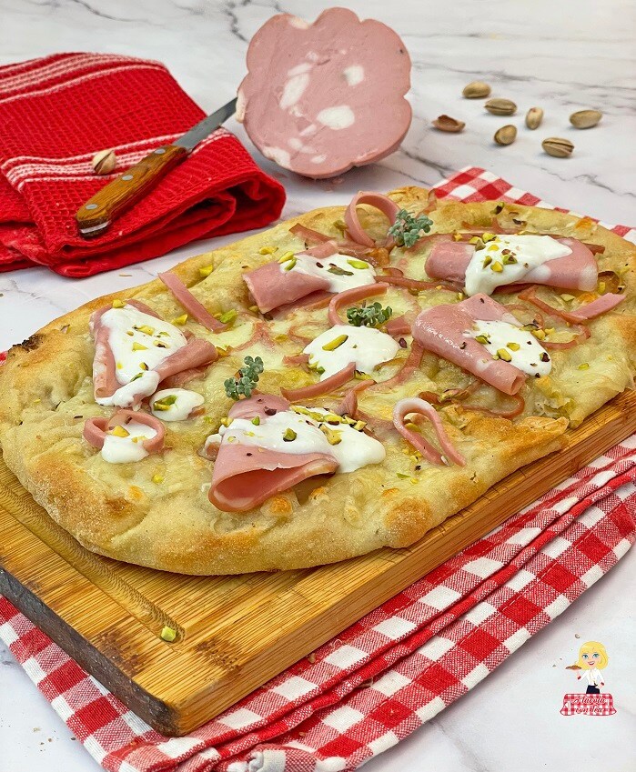 Hoy utilizaremos una base de pinsa ya lista (porque tenía esa en el refrigerador pero también la base de pizza cocida en horno de leña va genial) para preparar una deliciosa Pizza con Mortadela stracciatella de burrata y pistachos, una versión «Boloñesa» en la elección del condimento que he preferido a otros porque adoro la mortadela y encuentro que la combinación con la cremosidad de la stracciatella y la salinidad y crocantez del pistacho se casan a la perfección.