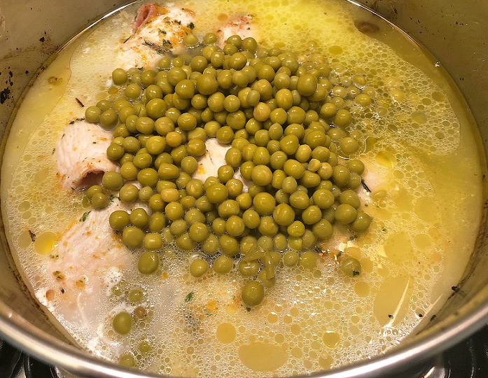 Añade los guisantes escurridos de su líquido de conservación, una pastilla de caldo vegetal y 2 vasos de agua.