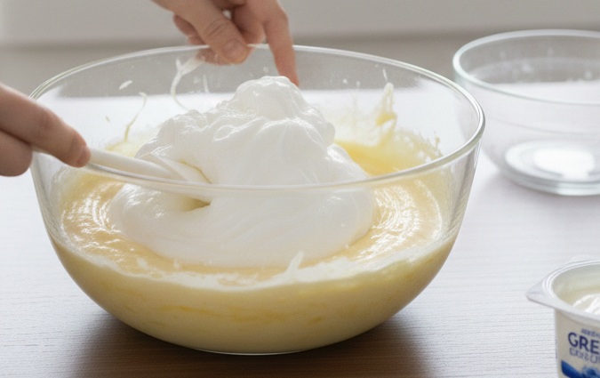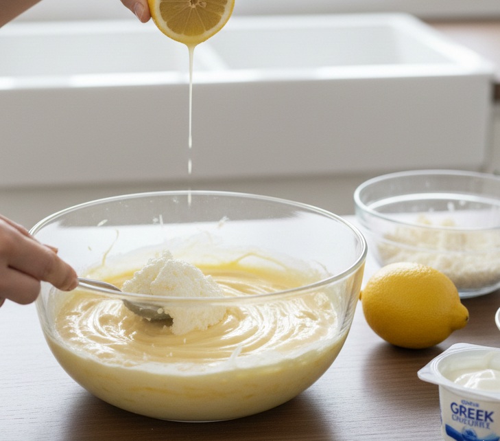 • Al batido de yemas añade la ricotta bien tamizada, el yogur griego y el zumo de limón. Bate todo con las varillas eléctricas hasta eliminar cualquier posible grumo, obteniendo una crema perfectamente homogénea. A continuación, incorpora con suavidad la harina de arroz (o la fécula) y la levadura para repostería.