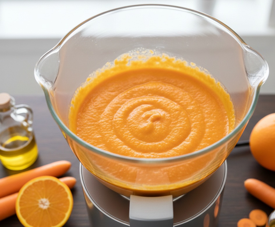 Pela las zanahorias y tritúralas finamente en un procesador junto con el aceite de semillas y el zumo de naranja hasta obtener una crema casi lisa. Este paso es el truco para una masa homogénea y sin «trozos» molestos.