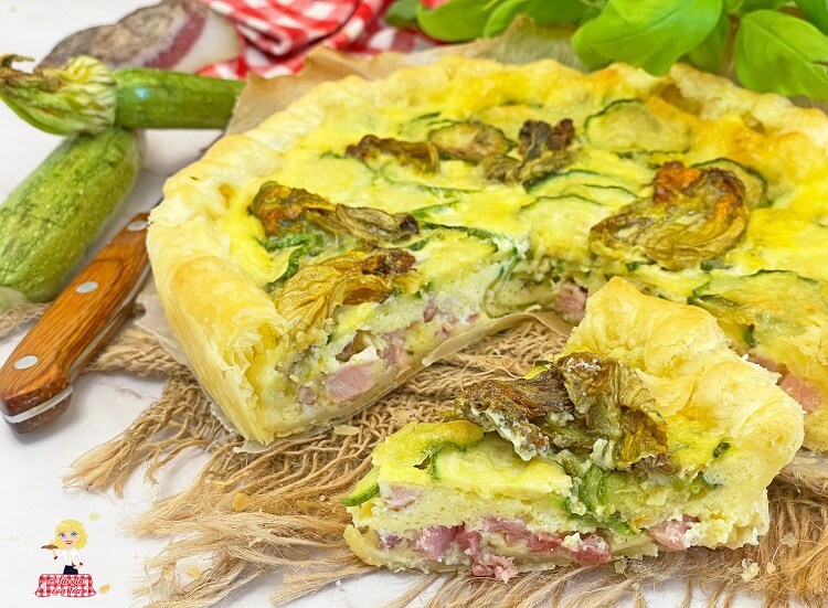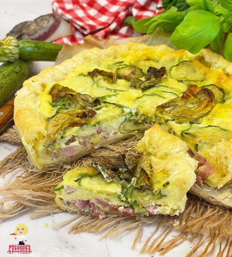 Esta Tarta Salada de Ricotta y Calabacines se compone de un clásico disco de masa de hojaldre con relleno de calabacines y sus flores cocidos en sartén con un chorrito de aceite de oliva virgen extra. Enriquecen el relleno, sin hacerlo pesado, ricotta, parmesano y speck (o panceta). Una ligera espolvoreada de parmesano y enseguida al horno durante unos 30 minutos.