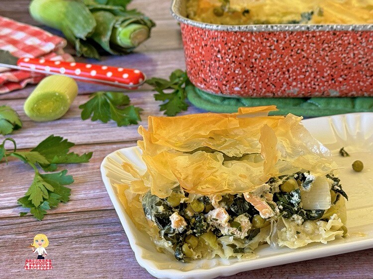 Para prepararla solo necesitarás hervir las espinacas frescas y los guisantes, cocinar ligeramente el puerro y mezclarlos con una mezcla de ricotta y yogur griego (o solo ricotta o crème fraîche). Mientras tanto, cocina ligeramente el salmón fresco en la sartén o al horno. Una vez cocido, desmenúzalo toscamente y añádelo a la mezcla de verduras y ricotta. Crea una envoltura en la bandeja con la pasta filo y hornea.
