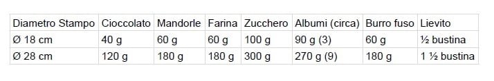 • Utiliza la tabla a continuación en caso de que decidas preparar una tarta más pequeña (diámetro 18 cm) o más grande (diámetro 28 cm). Obviamente, los tiempos de cocción deben modificarse en consecuencia. En general, para una tarta PEQUEÑA reduce el tiempo de cocción alrededor de 5 minutos, mientras que para una tarta GRANDE aumenta alrededor de 3/5 minutos. Siempre es válida la prueba del palillo para verificar la cocción interna de la tarta.