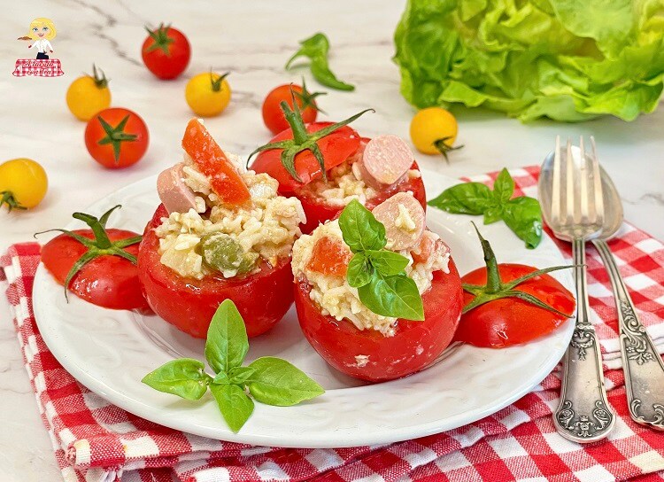 El relleno de estos tomates rellenos se puede preparar de mil maneras diferentes, hoy he preparado una especie de ensalada de arroz condimentada con atún, queso, salchichas y encurtidos, pero puedes usar los ingredientes que más te gusten.