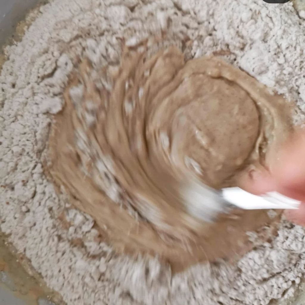 Ahora tomamos los polvos y comenzamos a verter la fécula de patata y la harina. Poco a poco hasta su total absorción.